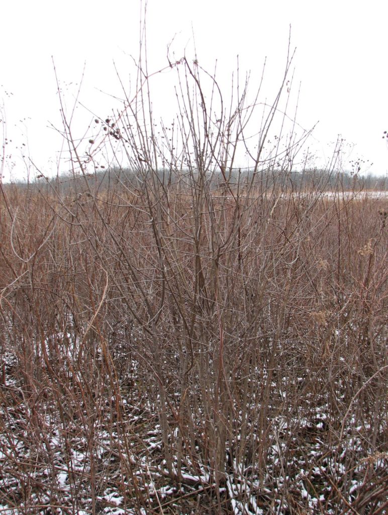 Here is a wider view of the above. The multi-stem common buckthorn is visible on the left. The entire area is full of woody brush. On the right are a lot of multiflora rose. Multiflora rose often grows under dead trees. The brush was too thick with too many thorns for me to get into the thicket to see if the cut stump of a larger tree was present. I need tough work clothes to traverse this mess.