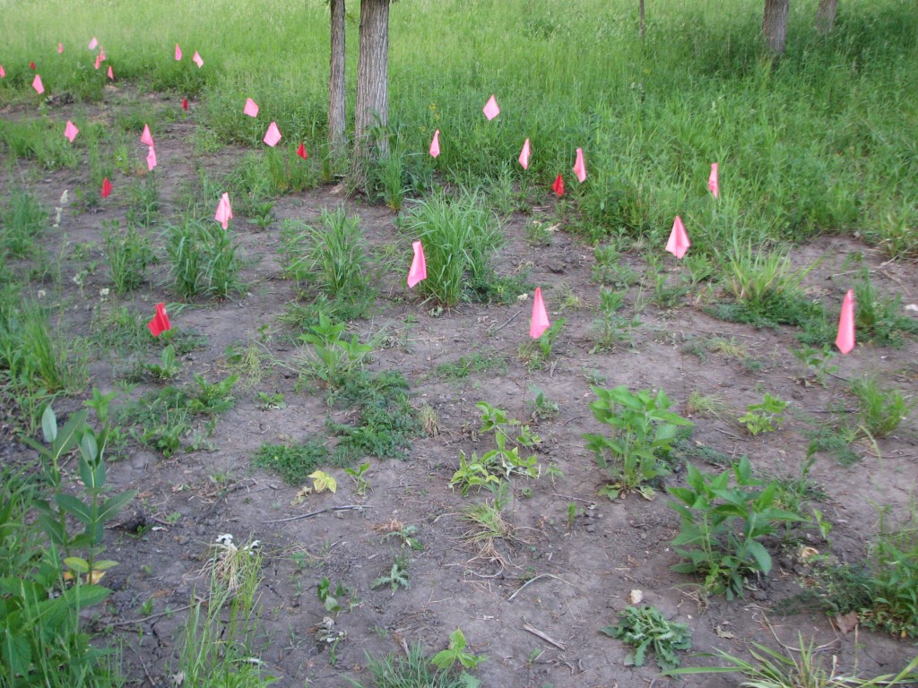 Immediately east of the Shoe Factory Road Prairie Nature Preserve under oak trees there were flags marking each sedge that had been planted. It looks like they could use some water.