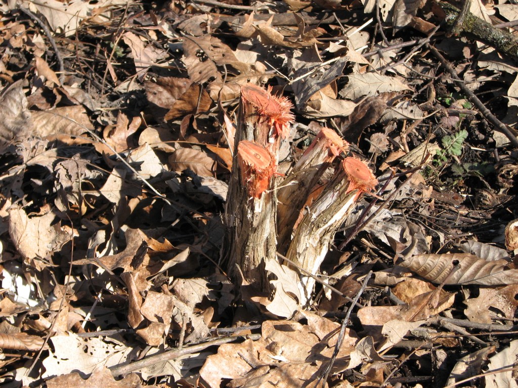 This is a photo taken on 2/11/2023 of an Asian bush honeysuckle stump that had herbicide applied.