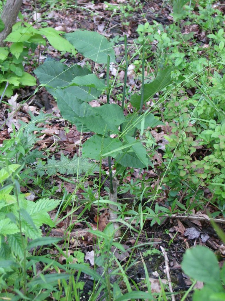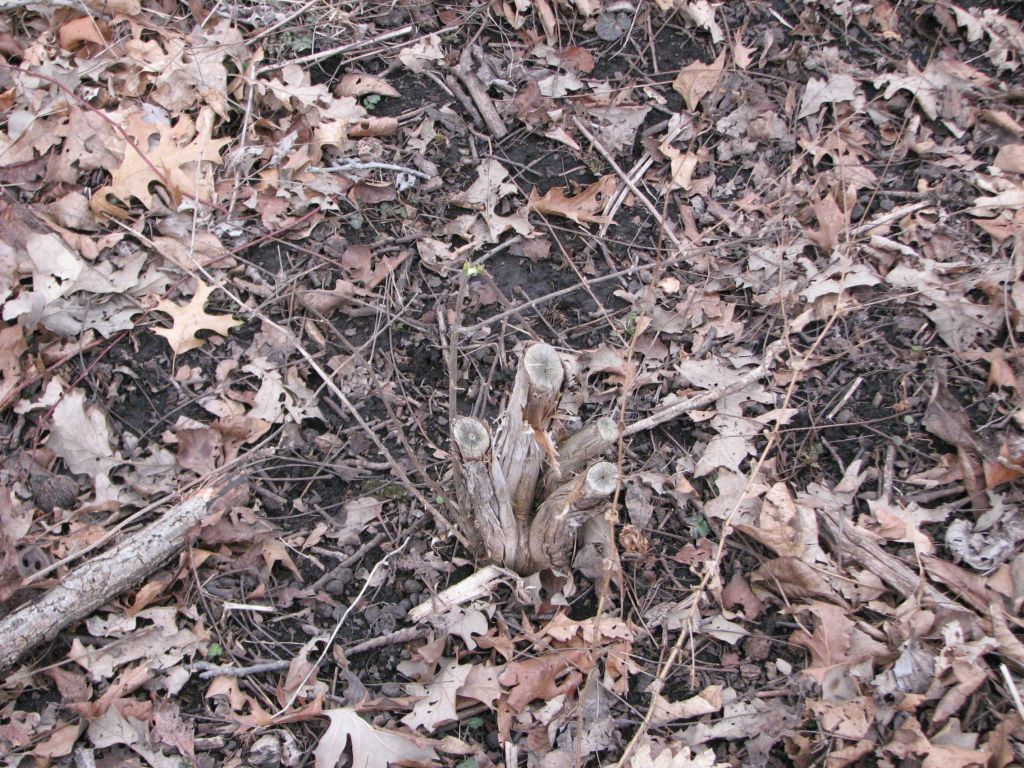 This is the same Asian bush honeysuckle stump on 6/11/2023. It has sprouted. The sprouts show the impact from the herbicide application. My experience has been this stump will likely recover from the level of damage I see in this image.