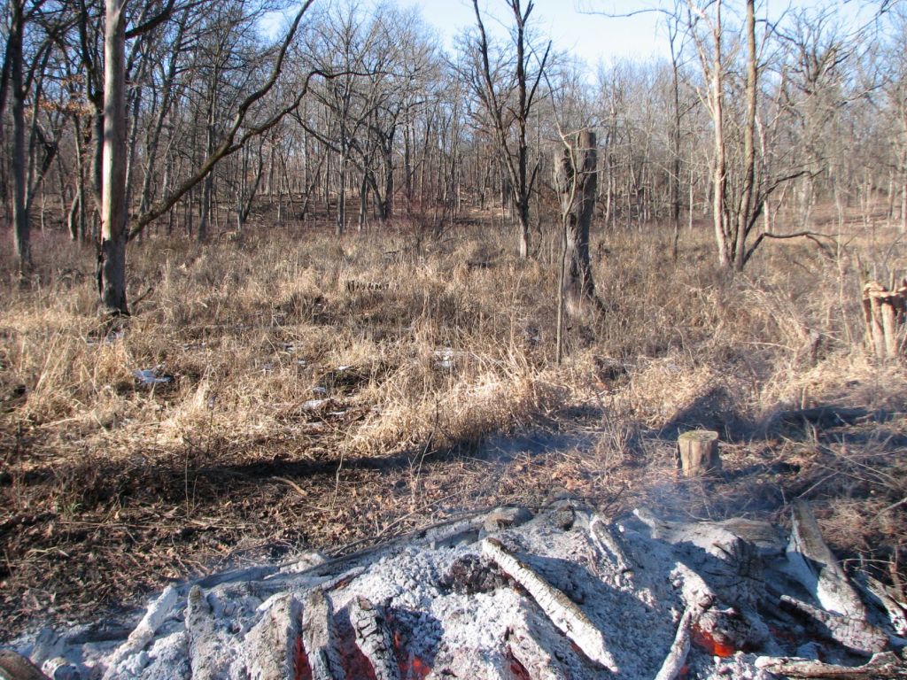 Field Thistle growing in a previous season’s burn scar with garlic mustard around the edge.