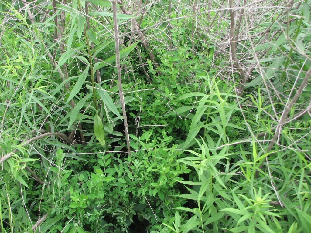 I walked out into the thick vegetation to the first Asian bush honeysuckle that is visible in the above images. This Asian bush honeysuckle was killed back to the ground by fire. The below image shows it has sprouted and how much it has grown in just one growing season.