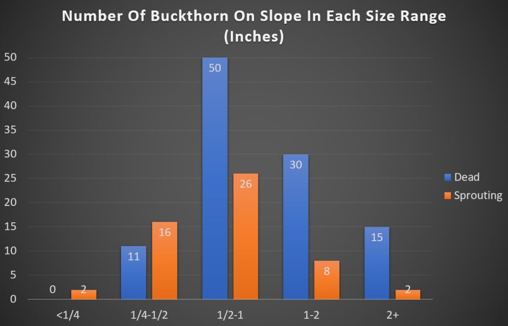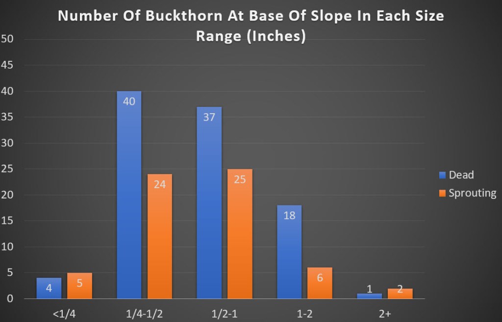 The base of the slope had more smaller buckthorn. This is likely because the base of the slope was toward the edge of the dense woody vegetation.