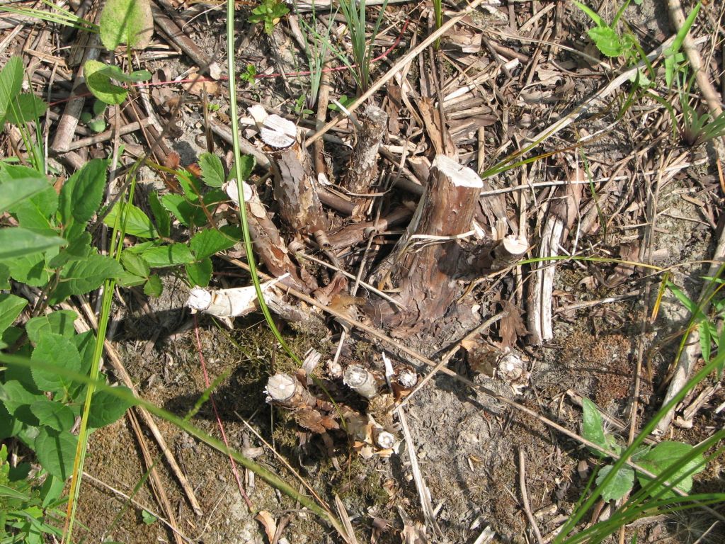 Composite image of Asian bush honeysuckles and a common buckthorn that were treated with triclopyr ester in basal oil. All the treated stumps in this image happened to be killed. Many of the larger Asian bush honeysuckle and common buckthorn were not killed by the herbicide application. The difference probably depended upon who was applying herbicide since a strip through the middle of the work area (left to right) had better control than further up slope or down slope (see above images).