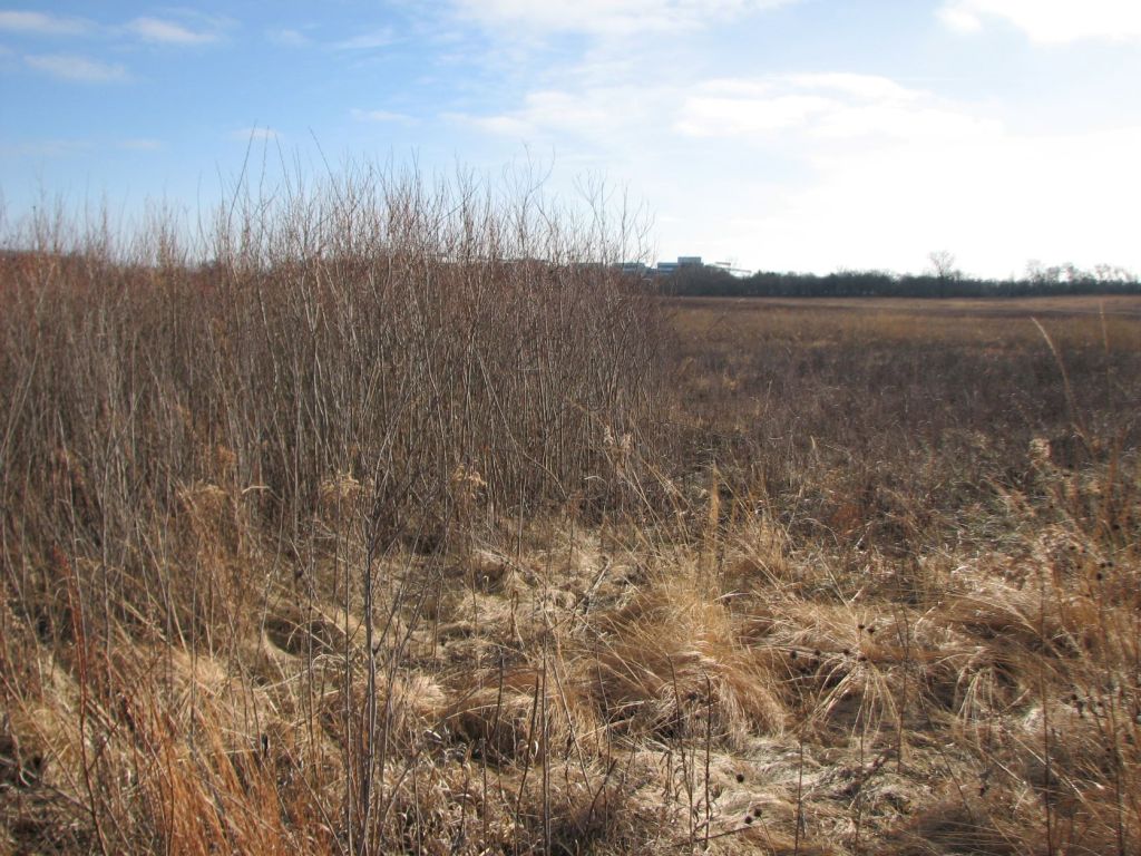 View looking directly out from the edge of the sandbar willow and eastern cottonwood stand into the recently mowed area. Reed canary grass and opportunistic weedy species have mostly filled in the area where sandbar willow and small eastern cottonwoods were mowed and treated with herbicide.