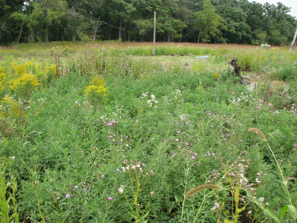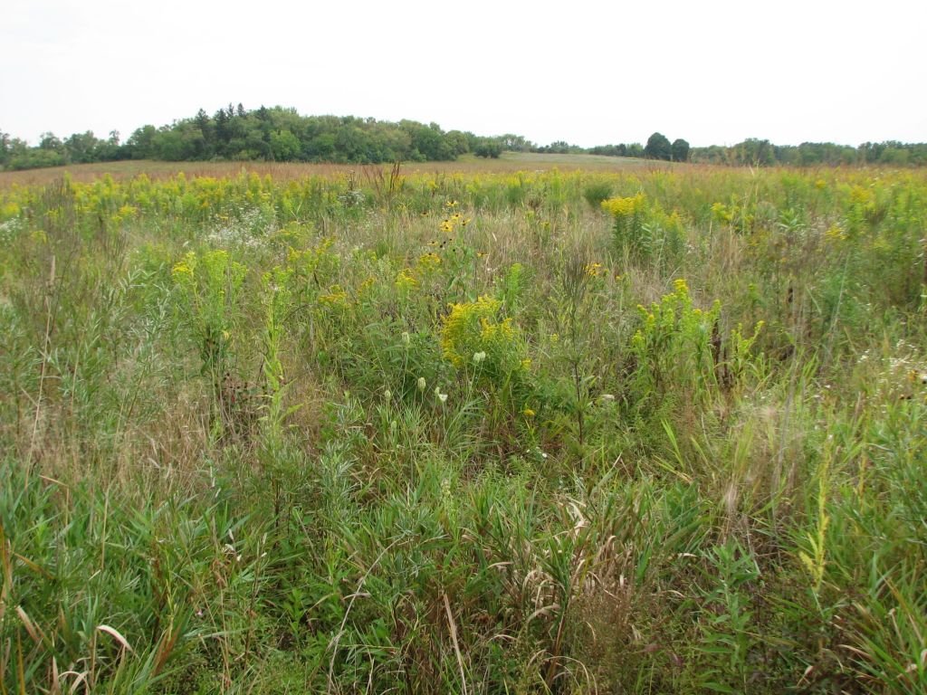View to the south of the edge of where the sandbar willows and eastern cottonwoods had been mowed and treated with herbicide. This area is full of tall goldenrod and other coarse plants. It will be a long time until this area will be better quality vegetation even with effort expended.