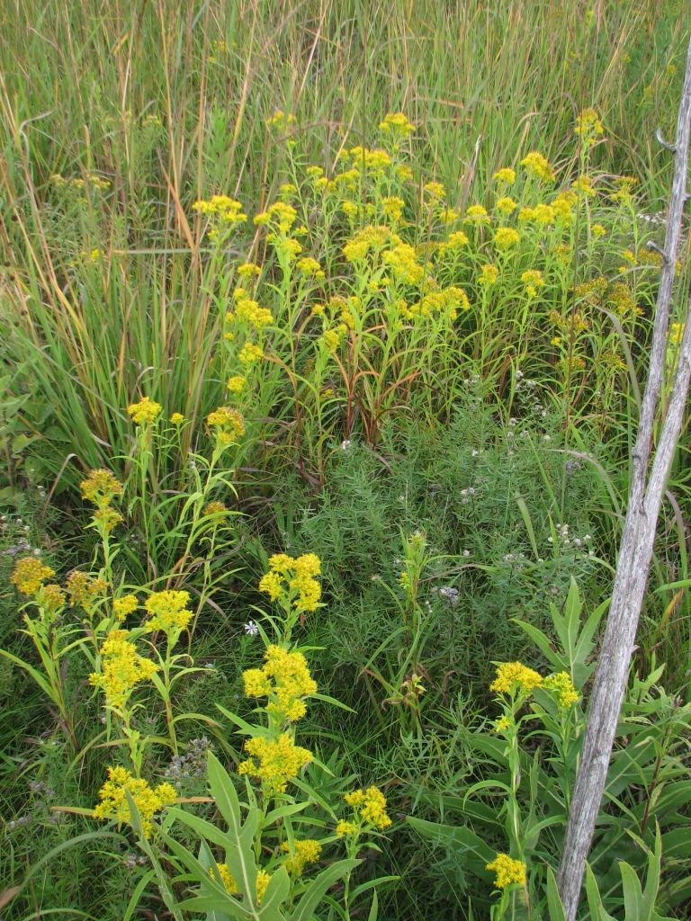 Grass-leaved goldenrod (Euthamia sp.) surrounded by tall goldenrod (Solidago altissima) with taller grasses in the background.