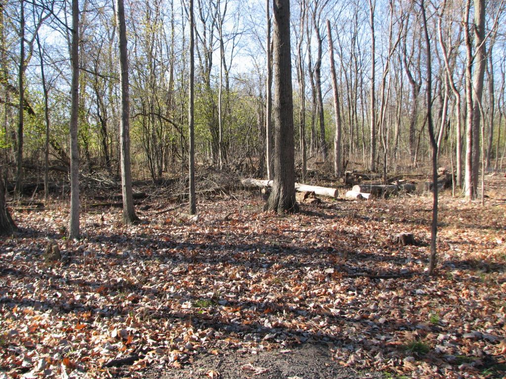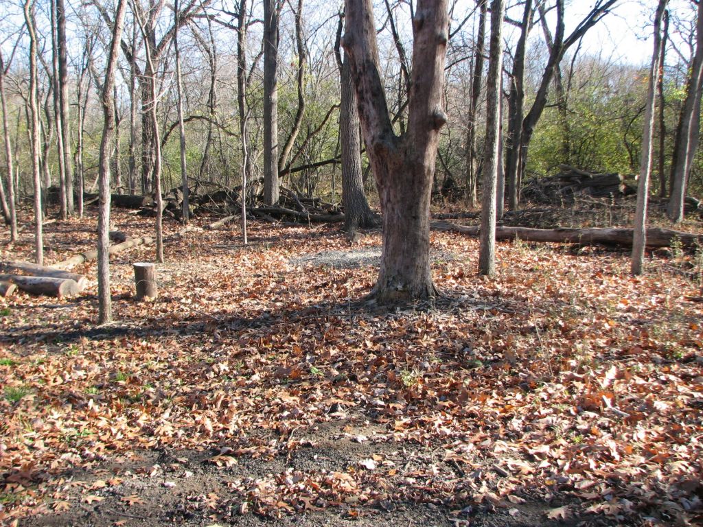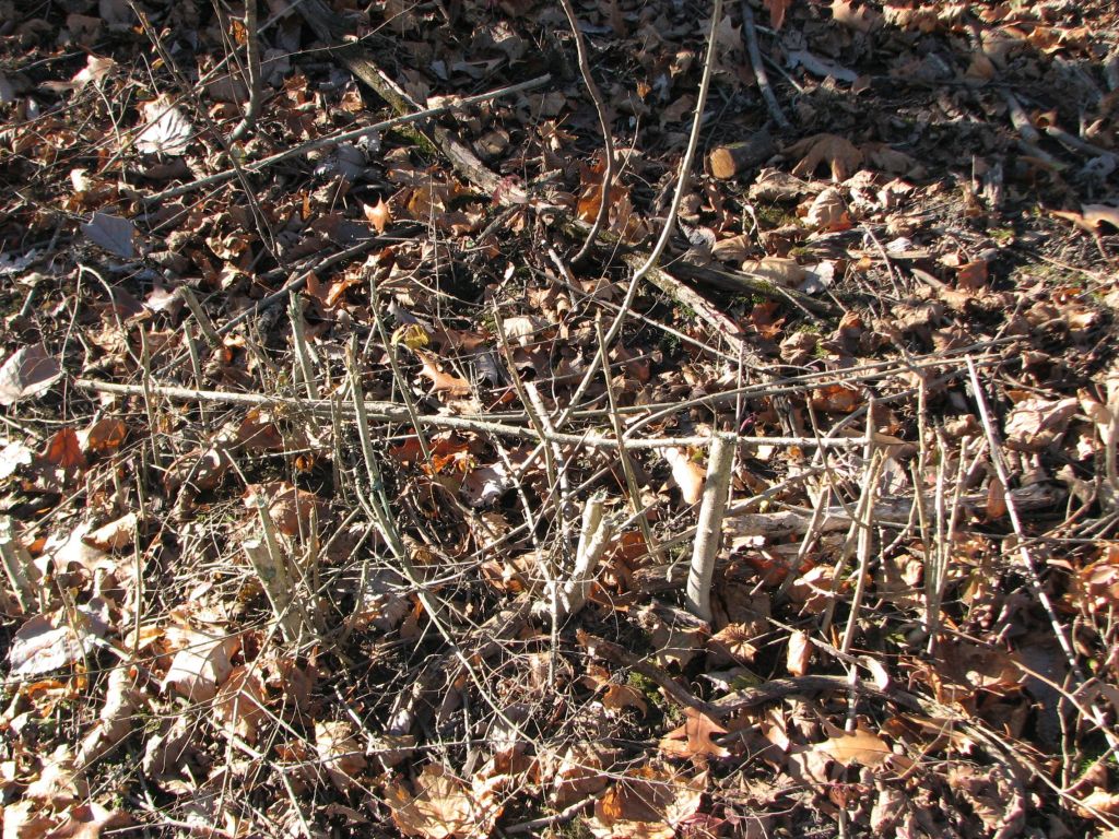This is an area where invasive woody species had already been removed just beyond the area where work was done during the fall/winter of 2022/2023. Likely, this area had work done during the fall/winter of 2021/2022. Two years after woody invasive species have been removed, the area is full of waist high privet. Can you see them? The reddish privet leaves blend in with the oak tree leaves.