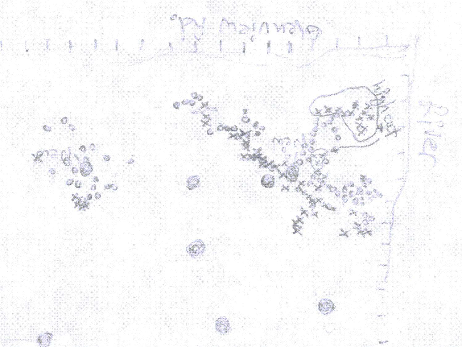 This is the map I made during my visit on 3/18/2023. The circles are stumps that were treated with herbicide and each “x” is a stump that was not treated with herbicide.