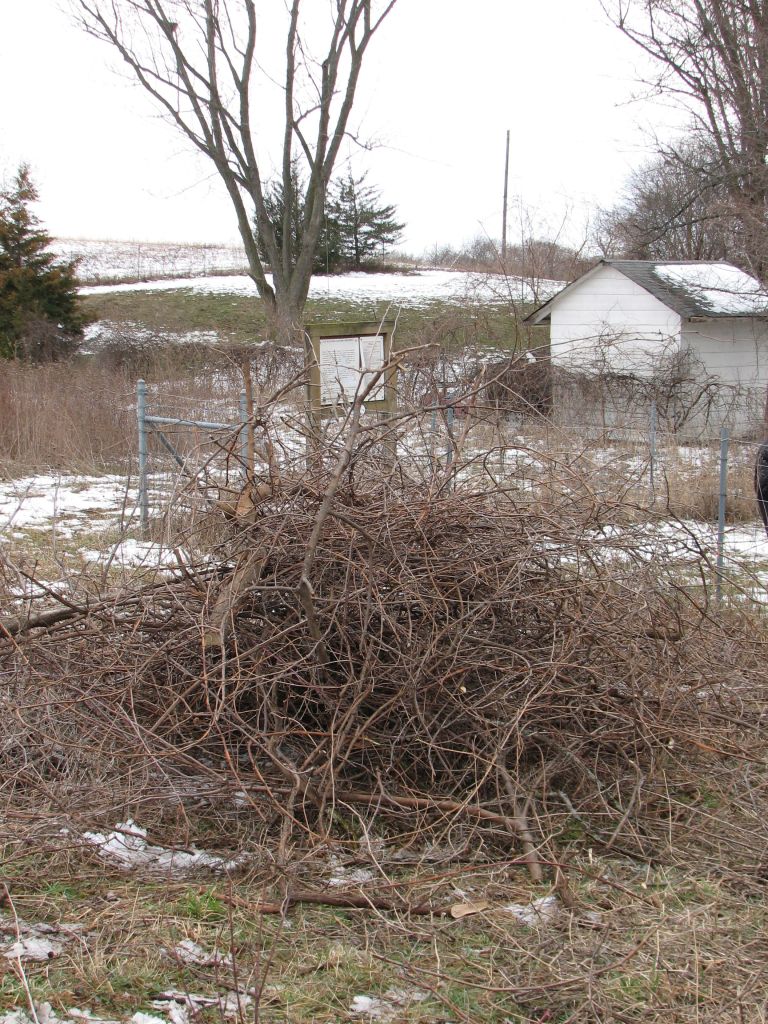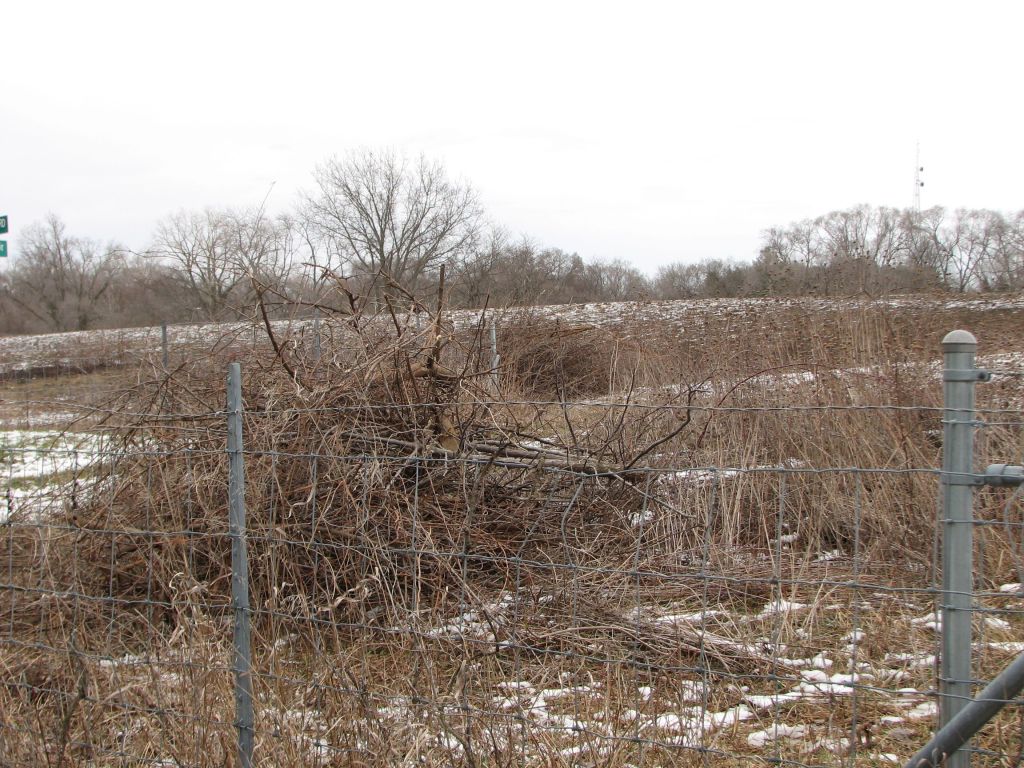 One of the brush piles after unwanted trees, shrubs, and vines growing along the fence were removed looking toward the preserve entrance.