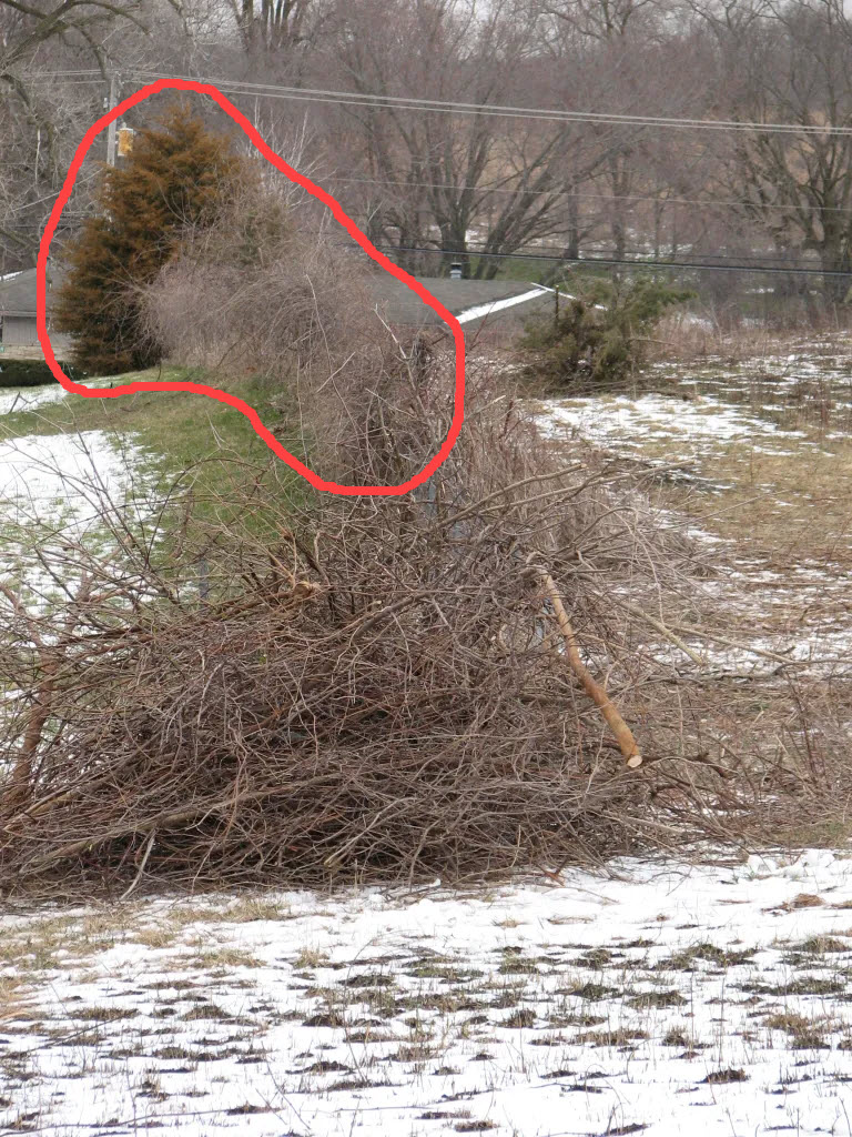 A brush pile visible in the background of the previous image along with a view of the fence along Flora Road. I circled in red an area where the vines and shrubs along the fence had not yet been removed (front) and trees had also not been removed (back) to give you an idea of how much work had to be done to clear woody vegetation along this fence.
