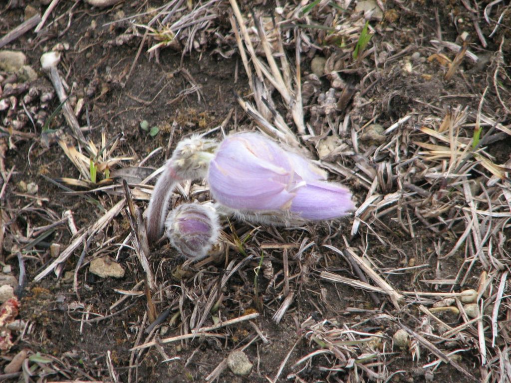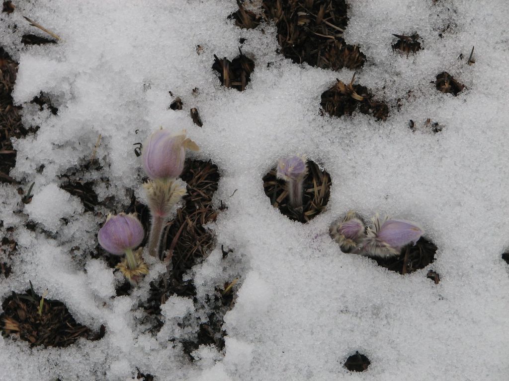 A group of Pasque Flowers surrounded by snow toward the top of the hill near a path.