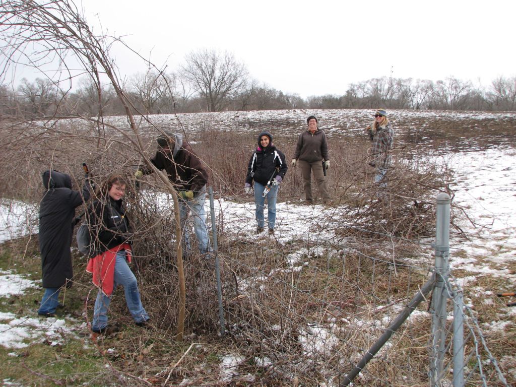 After the wildflower walk, volunteers removing woody species (many were non-native invasive), along the fence at and near the entrance to the preserve.