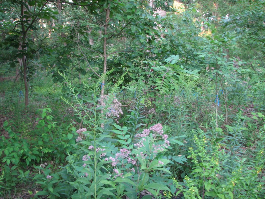 Sweet Joe Pye weed (Eutrochium purpureum) has been mostly eliminated from the area where herbicide was applied to buckthorn foliage. A patch of bellwort was able to recover, and wild hyacinth appears to not have been impacted.