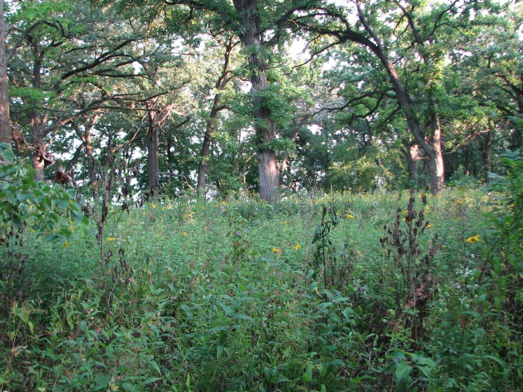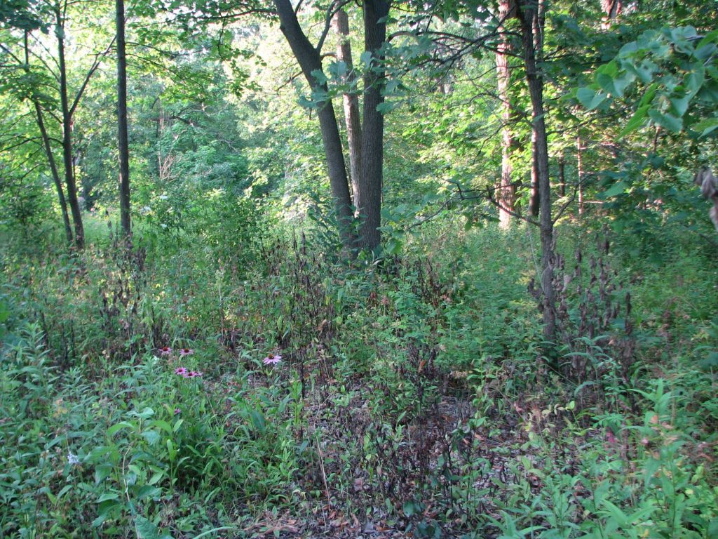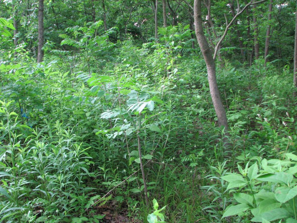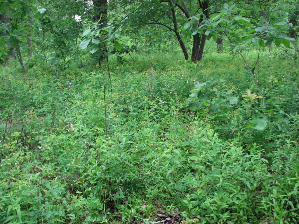 Closer view of vegetation showing wild geranium that has established where common buckthorn was cut and had stumps treated with herbicide.