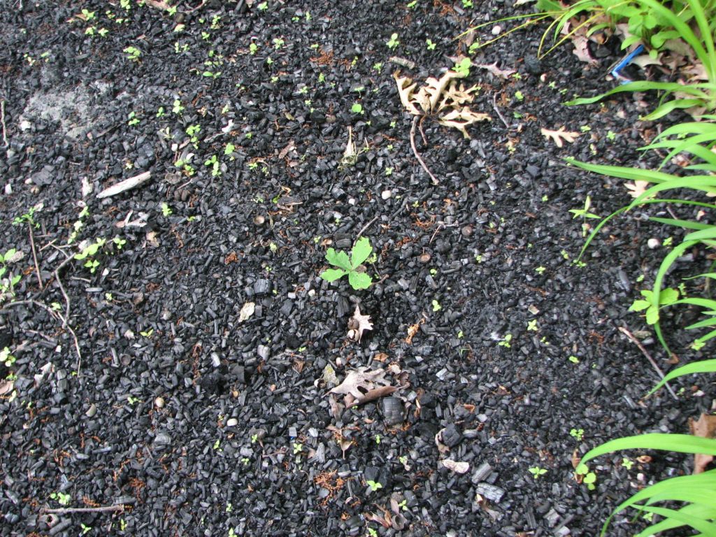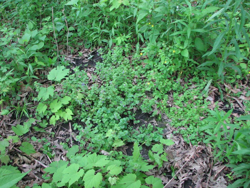 This is an image of the burn scar on 5/27/2024. This is a little over a year after this burn scar had been created. It has been colonized by creeping Charlie (Glechoma hederacea). I saw this happen to a burn scar on the north slope of Langham Island too.