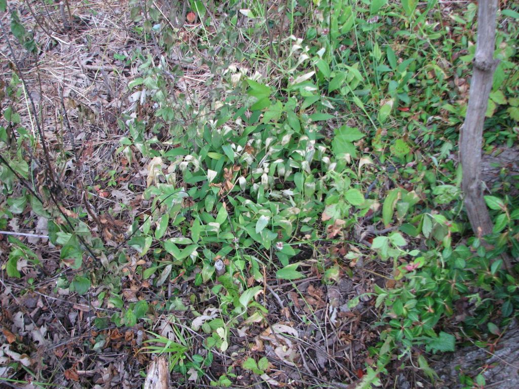 The foliage of this gray dogwood was treated with herbicide sometime this spring. Rain splashing the herbicide off the gray dogwood foliage has significantly impacted this colony of bellwort (Uvularia grandiflora).
