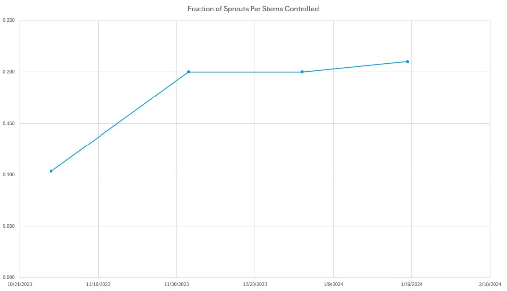 The chart does not include data points from November 5th or December 17th. On November 5th, 2023, I trialed an additional step of cutting the stems. The treatment on December 17th, 2023, had a lot of sprouting in an area where only 31 stems were treated and therefore was removed as an outlier. See discussion for possible reason.