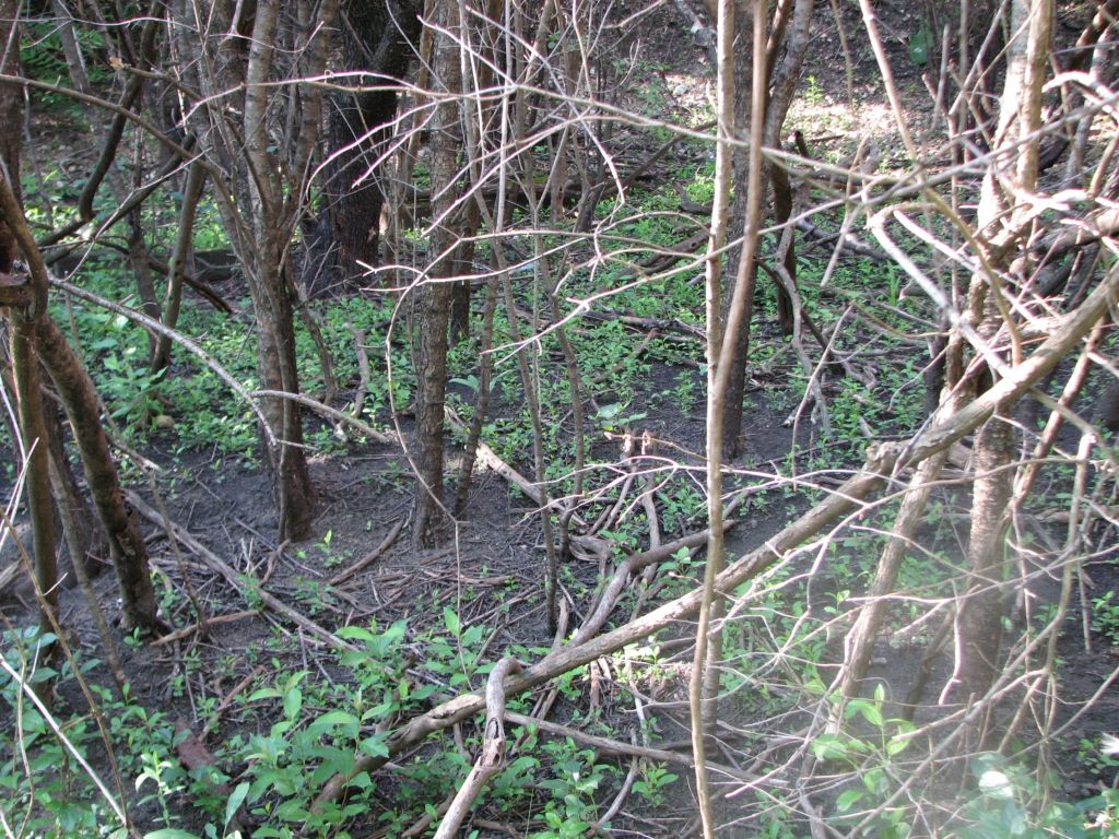 The below image is the ground under common buckthorns (Rhamnus cathartica) that had been controlled with 20 percent (V/V) triclopyr ester in basal oil applied to the basal bark. Rain occurred three days after the herbicide application. Typically, I want four, or preferably more, rain free days after applying this herbicide to avoid off-target damage. A lot of the bare ground that is visible is root exclusion of common buckthorn seedlings by the large dead common buckthorns. Some of the common buckthorn seedlings visible in the image are stunted and yellow. The ring-of-death is more than I typically prefer, but this does not matter much considering all native vegetation has been shaded to death by common buckthorns. All that is growing in the ground layer are common buckthorn seedlings and bittersweet nightshade.