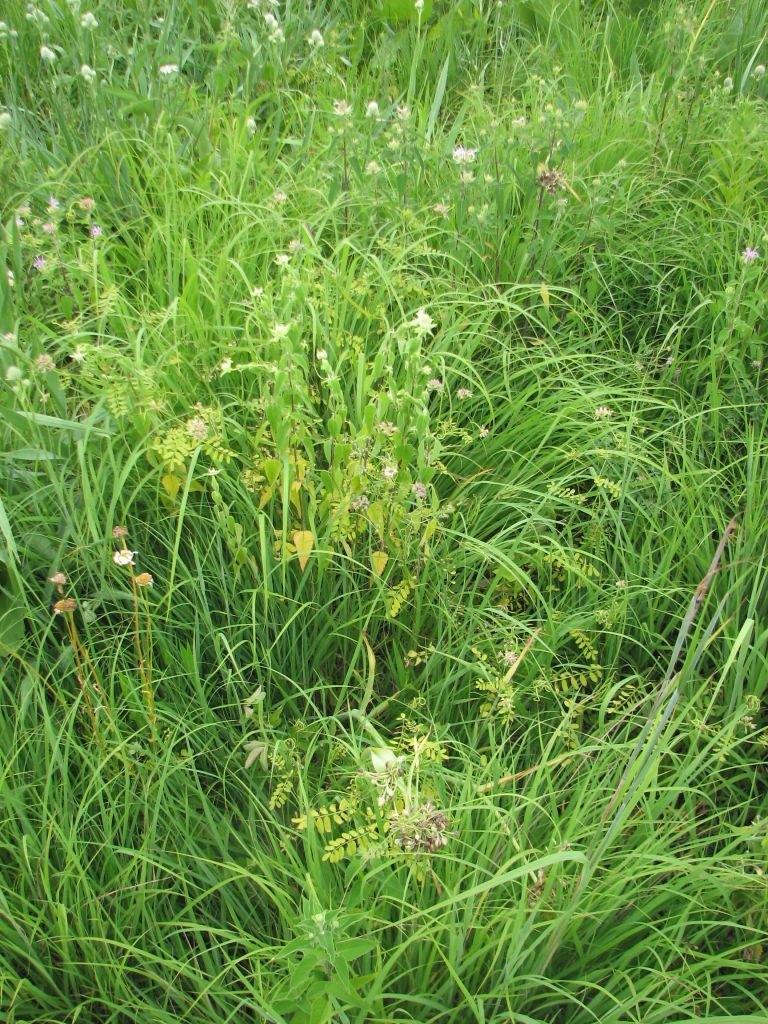 Herbicide impacted crown vetch and wild bergamot. Grasses appear to not have been affected by the herbicide spraying.