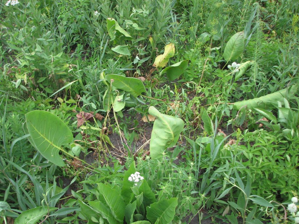 Wild quinine (Parthenium integrifolium) and rattlesnake master showing damage. Crown vetch visible in rear of the image.