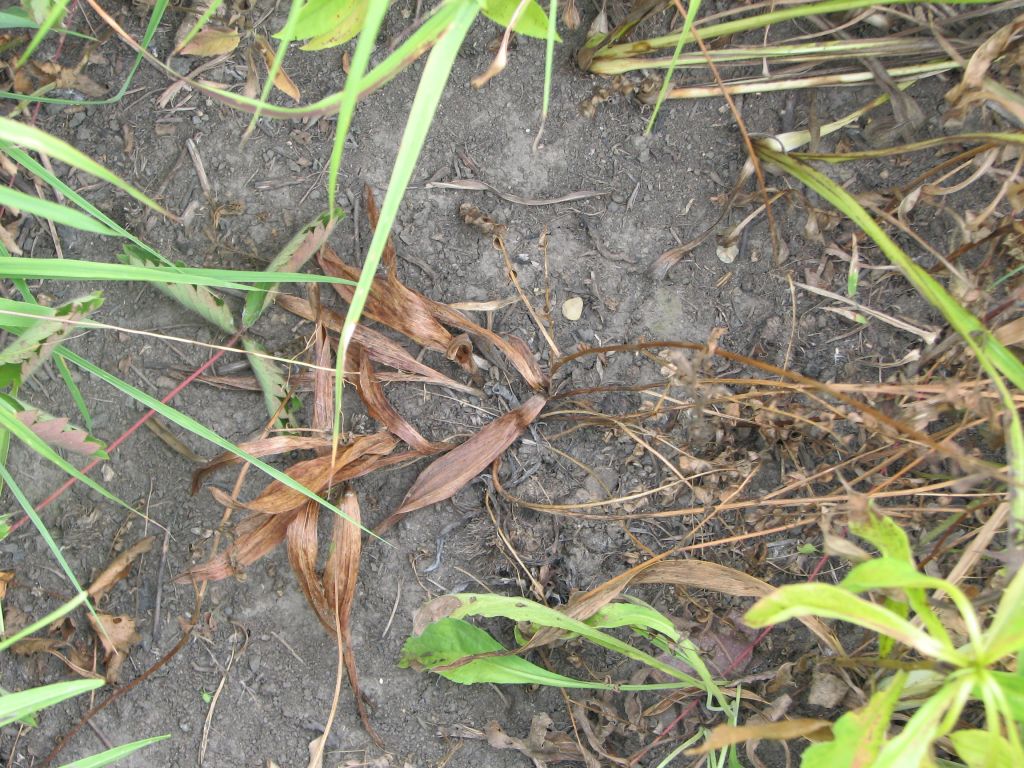 Herbicide killed (?) white lady’s-slipper orchid.