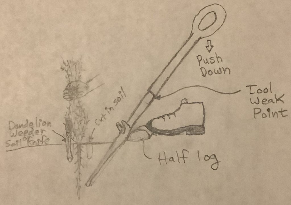 Comments on Soil Disturbance – When the NRG Weeder is pushed into the soil, some roots get cut. I try to do this work after rain when the soil is moist. This makes it easier to push the weeding tool into the soil and allows any plants that have had some roots cut to recover more quickly. The way the tool is used, the soil is lifted up from underneath the weed but not churned up as occurs when digging a hole. After the weed has been pulled out of the soil, the soil can be gently pressed back into place. Soil layers are not mixed, as occurs when digging a hole. I have not observed weeds growing where I have used this tool as occurs with major soil disturbance. This method eliminates weeds while not encouraging them.