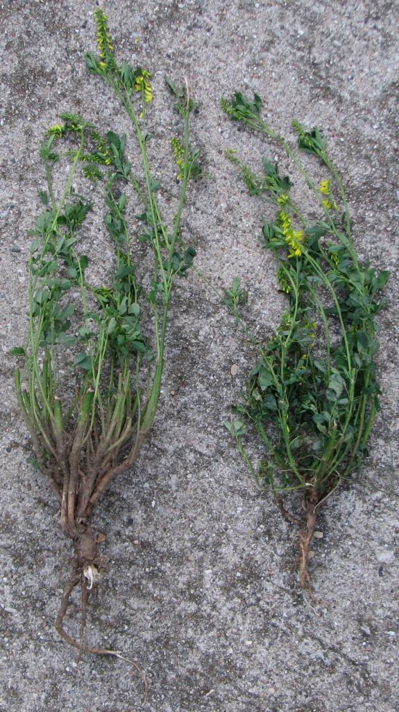 Yellow sweet clover I removed where it had been mowed along a trail in a nature sanctuary. The mowing was done below the lowest leaves but shoots sprouted and bloomed. Some of these shoots grew from below ground level. The plants were mowed a second time and sprouted again.