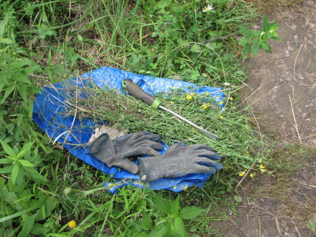 During this workday, seedhead were removed from invasive reed canary grass, Phalaris arundinacea. I saw bird’s-foot trefoil, Lotus corniculata, in the prairie reconstruction. I asked, and the steward was happy to let me remove it. I used my dandelion weeder to cut small plugs of soil around the taproot of the bird’s-foot trefoil so it would be easy to pull out of the ground.